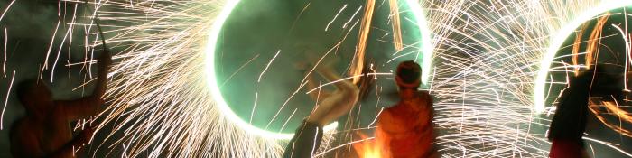 Giocare col fuoco. Quando il fuoco è il protagonista delle esibizioni in strada, non si può non restare affascinati dalle figure disegnate nella sera attorno al corpo danzante degli artisti. Bolas, code, corde, bastoni accessi, che disegnano attorno al corpo linee curve ed incastri. Non solo. Il passaggio dell'elemento sulla pelle e sulle lingue o la scomparsa della fiamma nella bocca dei fachiri. Non soltanto i bambini restano attratti dalle esibizioni dei mangiafuoco. E se poi, in uno spettacolo dal ritmo sostenuto, fisicamente tirato, teatralmente carico, accompagnato da ritmi coinvolgenti, entrano in gioco anche i combattimenti con spade e clave infuocate, con tanto di vincitori e perdenti, allora la partecipazione del pubblico è totale.