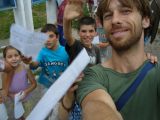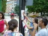 Il pomeriggio di oggi invece coi bimbi ci lavoriamo eccome. Nonostante la pioggia, che ci blocca di tanto in tanto, ci facciamo le nostre due orette di fatica ludica. Poi li prendiamo sotto braccio (o loro noi) e trottiamo verso il centro di Panciu. Sotto braccio tutti i disegni che hanno preparato ieri. Ai polsi i rotoli di nastro adesivo. Torniamo di nuovo ad occupare il paese con la nostra truppa di nani. Ad ogni punto strategico appuntiamo uno degli avvisi. Nel percorso le voci aumentano e pure lo sgambettio. Dietro uno dei complessi abitativi incontriamo, danzante solitario in un angolo, Vasilica/Gelu. È il matto del paese. Abbondantemente truccato, indossa una gonna lunga bianca e ascolta musica da una radiolina portatile. Dice qualcosa con passione e scappa al suo angolo. Due volte. Capito niente.